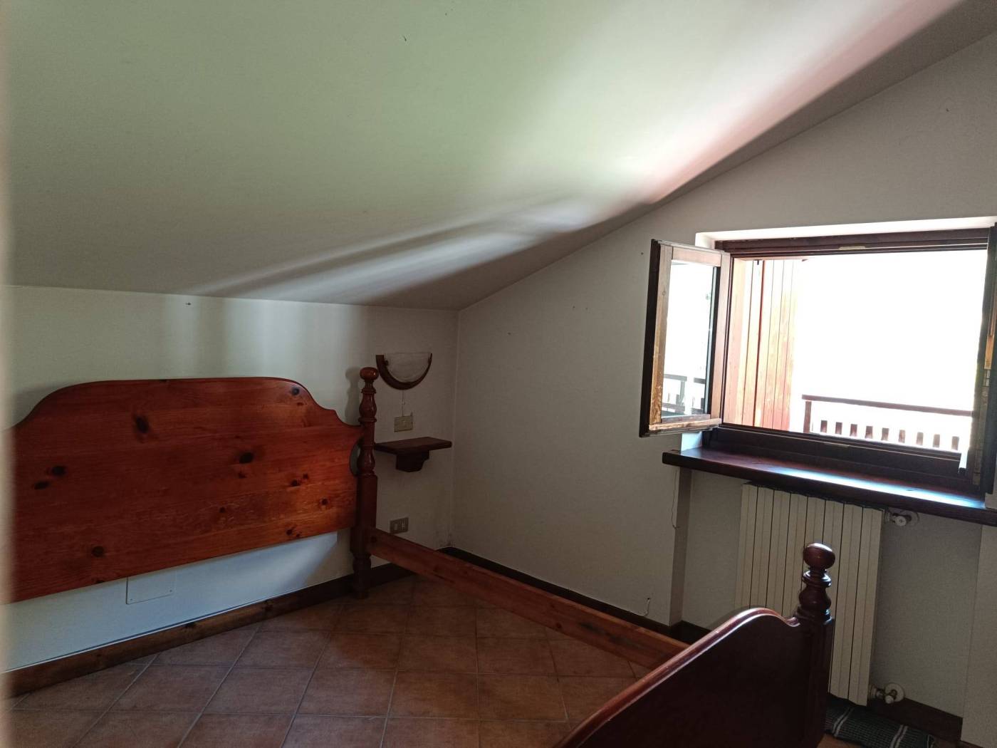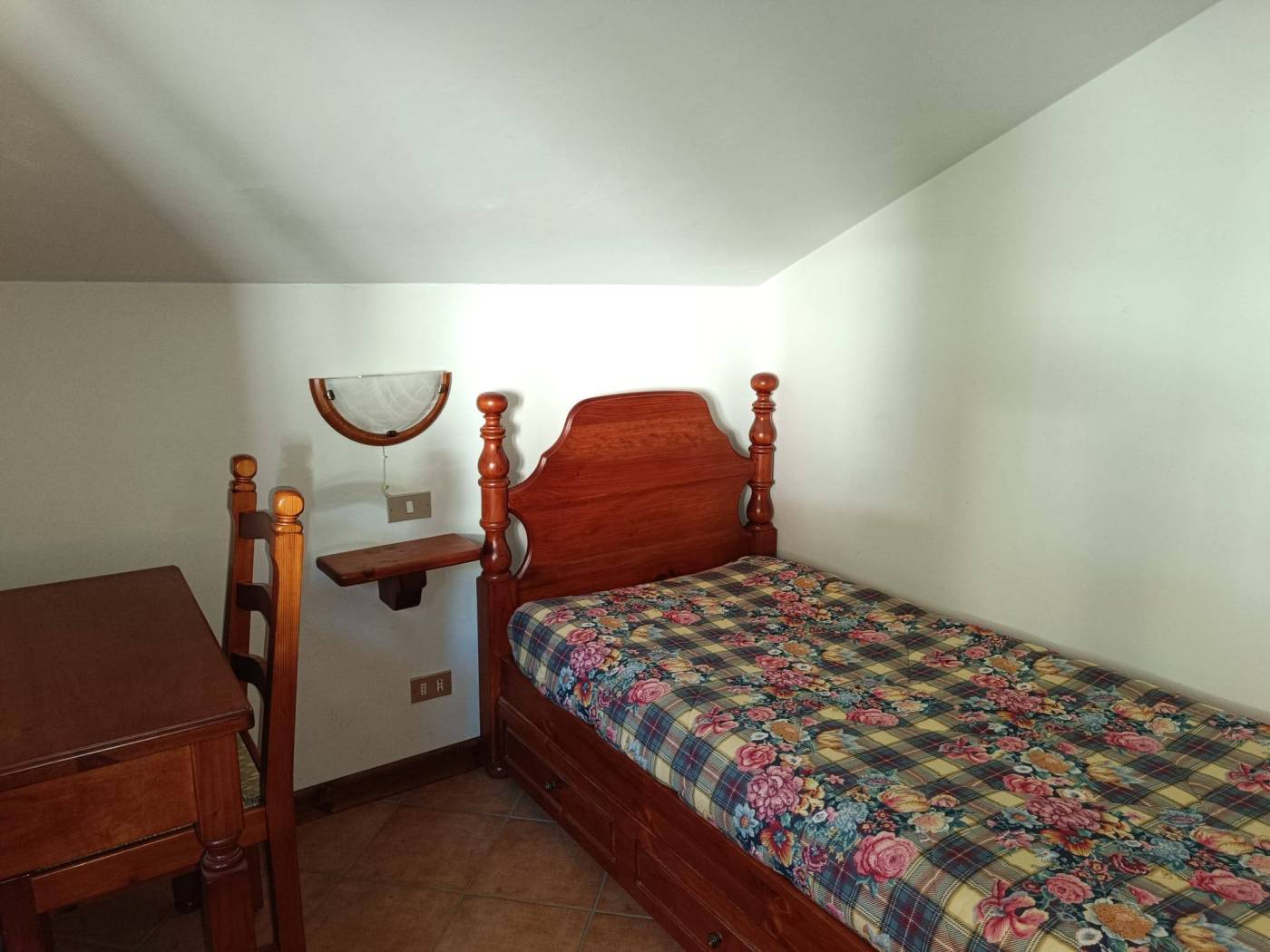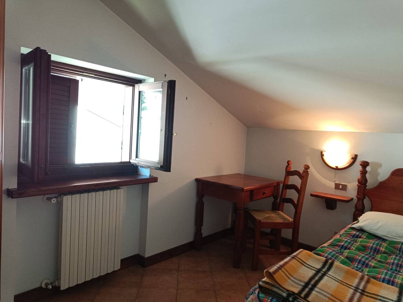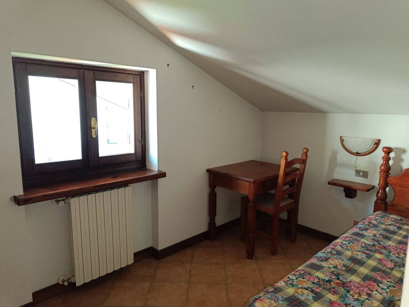 In palazzina edificata nel 1985, con ampio giardino condominiale attrezzato per pranzi e feste all'aperto, al piano1° appartamento in ottime condizioni, ingresso su luminoso soggiorno con angolo cottura, 2 camere mansardate, servizi, ampio terrazzo panoramico.