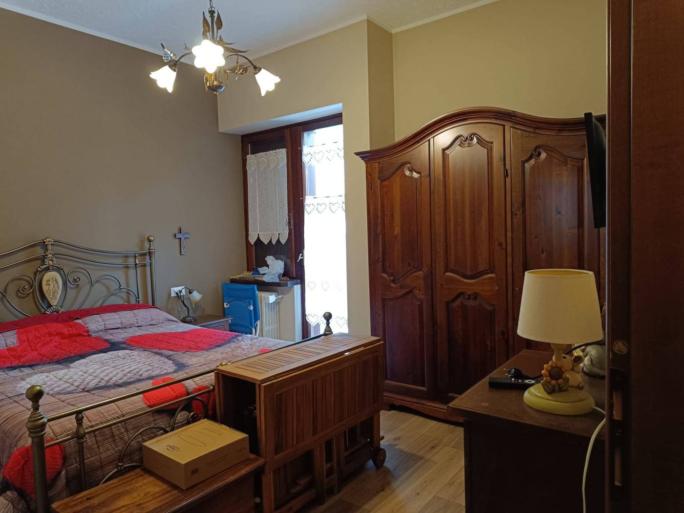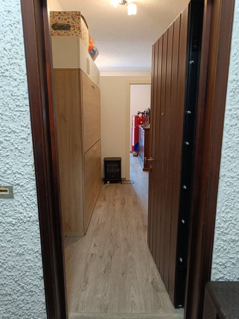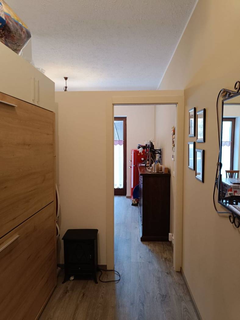 L'abitazione è composta da ampio ingresso (spazioso e ad oggi predisposto di letto a castello), soggiorno con cucina a vista e accesso al terrazzo vivibile, camera matrimoniale con accesso al 2° terrazzo, servizi con finestra, ampio box doccia e posto lavatrice. L'appartamento viene venduto PARZIALMENTE arredato. Riscaldamento semi-autonomo ed infissi in legno con doppio vetro.